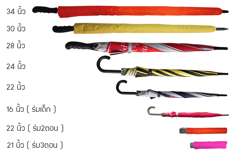 - ร่มตอนเดียว ขนาดกลางลูกค้านิยมสั่งมากที่สุดมี 4 ไซค์ด้วยกัน คือ 16 นิ้ว(ร่มเด็ก) 22 นิ้ว 24 นิ้ว(ขนาดยอดนิยมทำร่มตอนเดียว) และ 28 นิ้ว